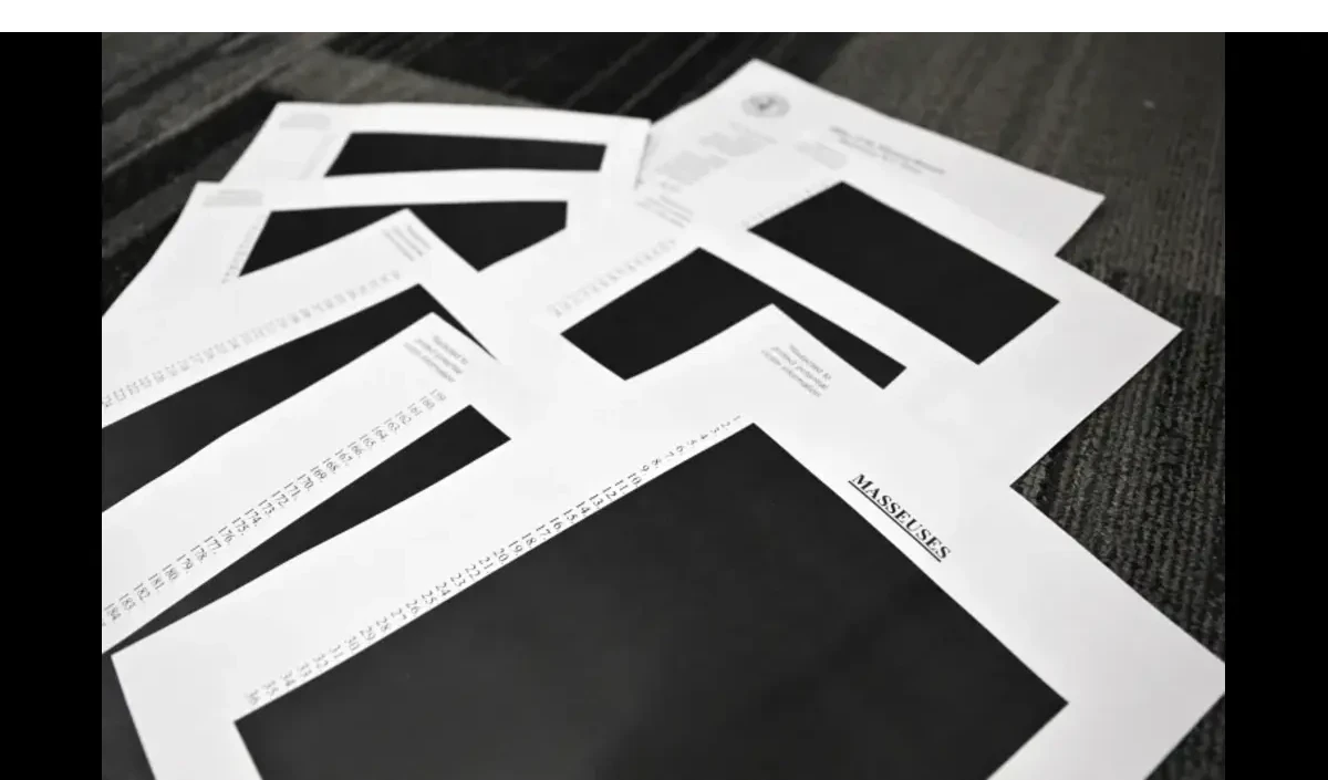 - अमेरिकी न्याय विभाग द्वारा दस्तावेज़ों में नामों और तस्वीरों को ब्लैकआउट किया गया।